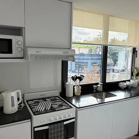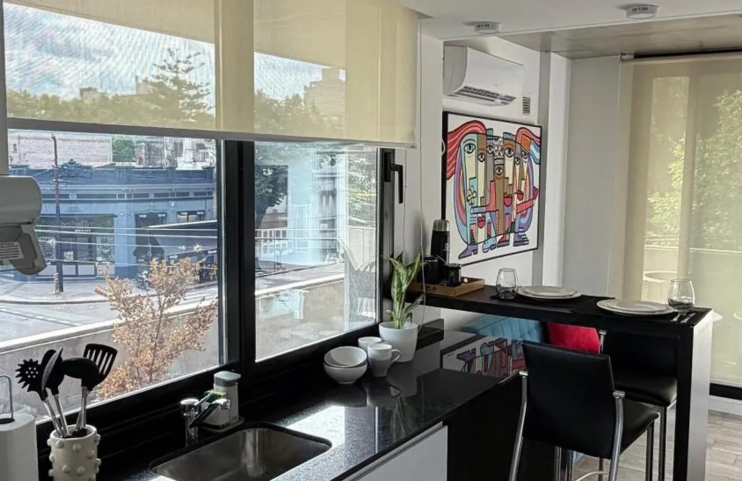 Dpto Franciaアパートメント内の台所で、お好みの食事を快適に調理できます。 この宿泊ほんの数分ほどのところにRosarioバス停があります。 テラスでリラックスできます。
